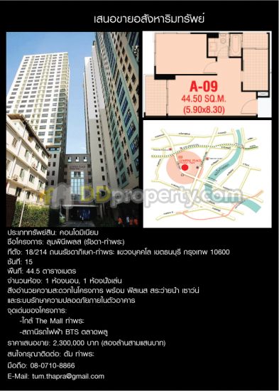 คอนโด ลุมพินี เพลส รัชดา-ท่าพระ (Lumpini Place Ratchada-Thapra) ถ.รัชดาภิเษก, พื้นที่ใช้สอย 44.5 ตร.ม. คอนโดสูง 29 ชั้น 15 วัสดุปูพื้นไม้ลามิเนต วิวระเบียงมองเห็นเมือง มี 1 ห้องนอน 1 ห้องน้ำ 1 ห้องรับแขก 1 ห้องครัว แอร์ 2 เครื่อง ที่จอดรถ 1 คัน