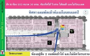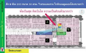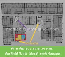 ห้องที่ขายคือห้องตึก B เลขที่ 203 ขนาด 30 ตรม 1 ห้องนอน 1 ห้องนั่งเล่น และห้องครัวแบบปิด ราคาหน้าสัญญา 1,390,000 บาท