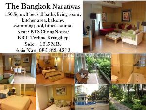 area 150 sqm. Fl#1, Lowrise Condominium, Resort style, 3 Bedroom 3 Bathroom 1 Living room 1 kitchen Built-in counter including electrical hood, hop, sink , Built-in decorated, 2 air con. Refrigerator, Fully Furnished, Best view, large swimming pool, 2 parking space and Sports club, very fast to Silom, Sathon, BTS, BRT Ready to move-in price: 13,500,000 Bath