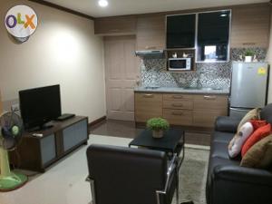 เครื่องปรับอากาศ, 1 ที่จอดรถ มีเฟอร์นิเจอร์ครบพร้อมอยู่ เพิ่งตกแต่งใหม่ ปูกระเบื้องพื้นใหม่ เคาท์เตอร์ครัวพร้อมเตาไฟฟ้าและที่ดูดควันและตู้เย็น สาธารณูปโภคโครงการ ได้แก่ สระว่ายน้ำ ฟิตเนส ซาว์น่า ที่จอดรถ รปภ 24 ช.ม.