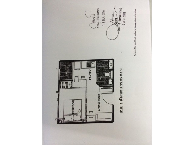 ห้องขนาด : 22.05 ตร.ม 1 ห้องนอน 1 ห้องน้ำ 1 ระเบียง