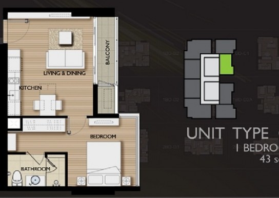 1.TYPE B1 ขนาด 42 ตรม. ชั้น 6++ ขนาด 43 ตรม.เป็นห้องหัวมุมสวยสุดของตึก มีกระจก 2 ด้าน 2 วิว ผนังไม่ติดกับห้องอื่น 3 ด้าน ได้ความเป็นส่วนตัวสูงกว่า เห็นวิว