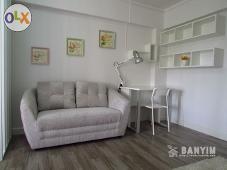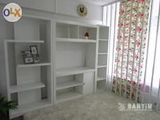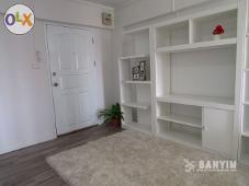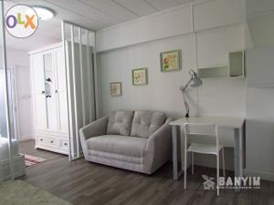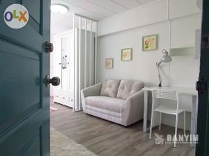 ห้องชั้น 5 อาคาร 1 ห้องสตูดิโอ มีระแนงกั้นแบ่งสัดส่วนที่นอนและส่วนนั่งเล่น 1ห้องน้ำ 1แอร์ ตกแต่งเรียบร้อยเฟอร์นิเจอร์ SB ครบชุด หิ้วกระเป๋าเข้าอยู่ได้เลย เตียง 5 ฟุตมีลิ้นชักด้านล่าง ตู้เสื้อผ้า 3 บานเปิด ชั้นวางทีวี ตู้หนังสือ โต๊ะเขียนหนังสือ โซฟา 2 ที่นั่ง สไตล์วินเทจ ด้านหลังห้องมีระเบียงกว้าง มีซิงค์ล้างจาน วางเครื่องซักผ้าได้ มีแอร์ 18000 BTU 1 เครื่อง