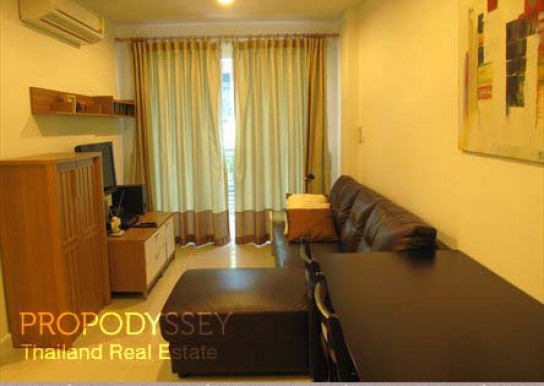 1 bedroom condominium with 1 bathroom on the 2nd floor. Living room with a lot of shelf, sofa set, coffee table, TV stand. Dining area is connected with open plan kitchen with 2 heads of electric stove, microwave refrigerator.