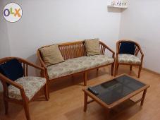 a television, a refrigerator, a washing machine, a telephone , a cupboard, a table and a queen size bed.