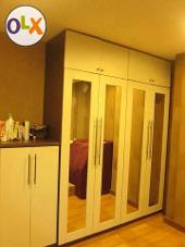 The 6-foot bed with mattress, wardrobe, dressing table with chair, shelves, TV.