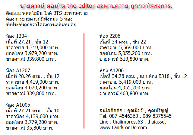 The Editor ติด bts สะพานควาย ขายดาวน์รวมผ่อนแล้ว16 งวด - คอนโด ขายดาวน์