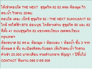 ให้เช่าคอนโด THE NEXT สุขุมวิท 52 52 ตรม ห้องมุม วิวสระน้ำ วิวสวน 20พบ.