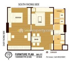 คอนโดขนาด 1 ห้องนอน 1 ห้องนั่งเล่น 1 ห้อง Pantry 1 ห้องน้ำ 1 ระเบียง >>> พื้นที่กว้างรวม 42.33 sq.m ห้องมุม ชั้น 5 อาคาร D