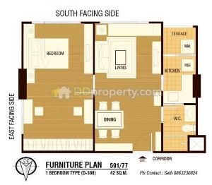 Size : 1 Bedroom + 1 Living + 1 Pantry + 1 Bathroom + 1 Balcony >>> Totally 42.33 sq.m, Corner View @ 5th Floor, Building D