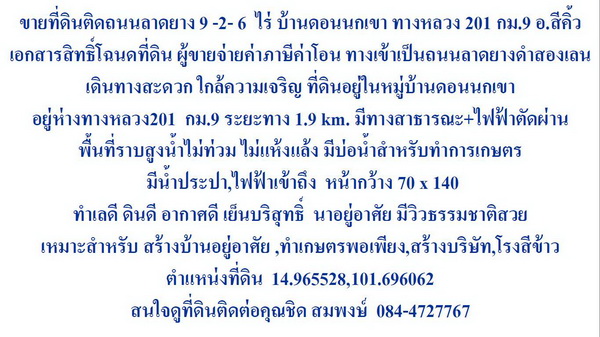 ขายที่ดินติดถนนลาดยาง 9 - 2 - 6 ไร่ บ้านดอนนกเขา ราคา ทางหลวง 201 กม.9 อ.สีคิ้ว เอกสารสิทธิ์โฉนดที่ดิน ผู้ขายจ่ายค่าภาษีค่าโอน ทางเข้าเป็นถนนลาดยางดำสองเลน เดินทางสะดวก ใกล้ความเจริญ ที่ดินอยู่ในหมู่บ้านดอนนกเขา อยู่ห่างทางหลวง201 กม.9 ระยะทาง 1.9 km. มีทางสาธารณะ+ไฟฟ้าตัดผ่าน พื้นที่ราบสูงน้ำไม่ท่วม ไม่แห้งแล้ง มีบ่อน้ำสำหรับทำการเกษตร มีน้ำประปา,ไฟฟ้าเข้าถึง หน้ากว้าง 70 x 140 เมตร พื้นที่ใช้สอย 15,200 ตรม. ทำเลดี ดินดี อากาศดี เย็นบริสุทธิ์ น่าอยู่อาศัย มีวิวธรรมชาติสวย เหมาะสำหรับ สร้างบ้านอยู่อาศัย ,ทำเกษตรพอเพียง,สร้างบริษัท,โรงสีข้าว ตำแหน่งที่ดิน 14.965528,101.696062 สนใจดูที่ดินติดต่อคุณชิด สมพงษ์ 084-4727767 watthanadeelife@hotmail.com