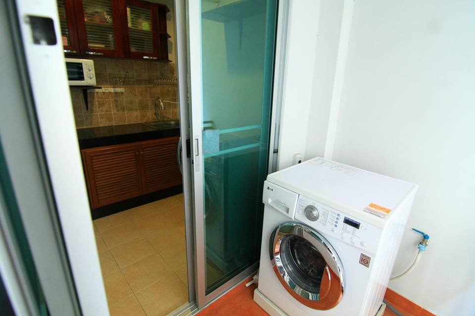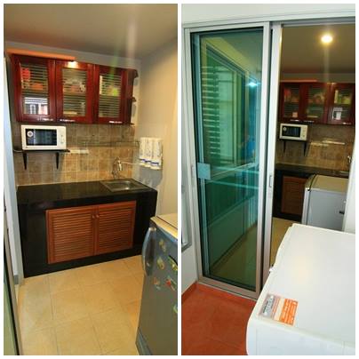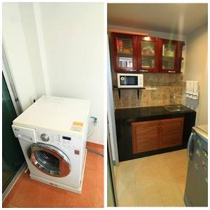 3.ห้องครัว มีชั้นเก็บของ ตู้ไม้เก็บเครื่องครัว ห้องครัวตกแต่งไป 9,000 บาท, ระเบียงห้องสามารถวางเครื่องซักผ้า มีราวตากผ้าสแตนเลสแบบยึดติดผนัง