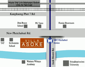 Location: Close to the Asoke / Ratchadaphisek intersection, and near to both the MRT Petchaburi 150 Mete and Airport Rail link station at Makkasan. Near BTS NANA 600 Mete. Just a single stop away from the shopping centers of Terminal 21 and Central Plaza Rama 9.