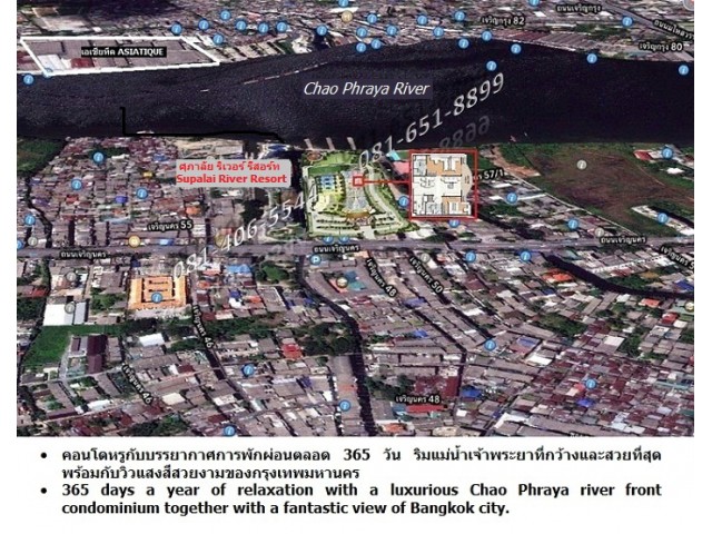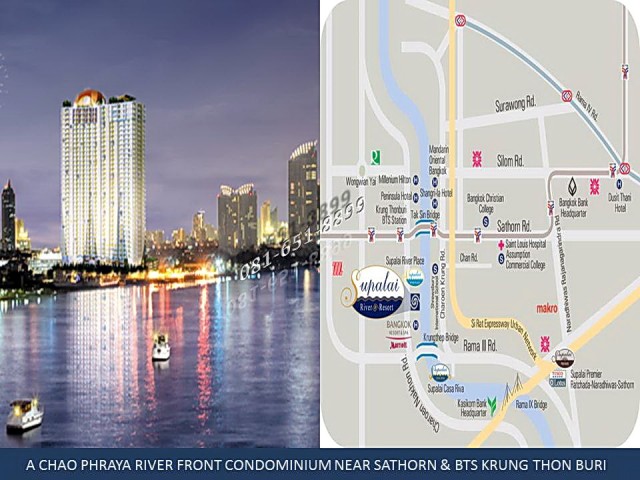Supalai River Resort, A Luxurious Chao Phraya River Front Condominium, near BTS Krung Thon Buri (only one station arrived Sathorn rd.) A limited special design of 2 bedrooms (only one room on each floor), 88.0 sqm. of River Front Suite which its room position is on the Chao Phraya River front on 24th floor with best view of Chao Phraya River curve for sales of down payment.