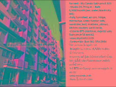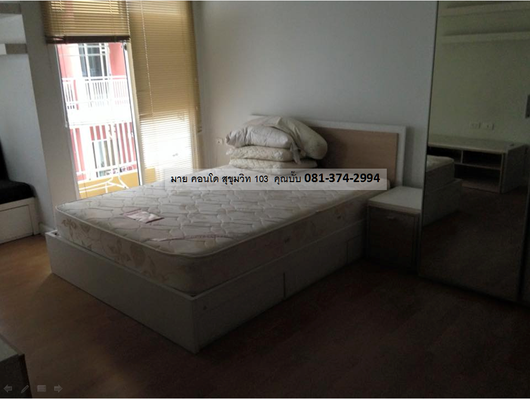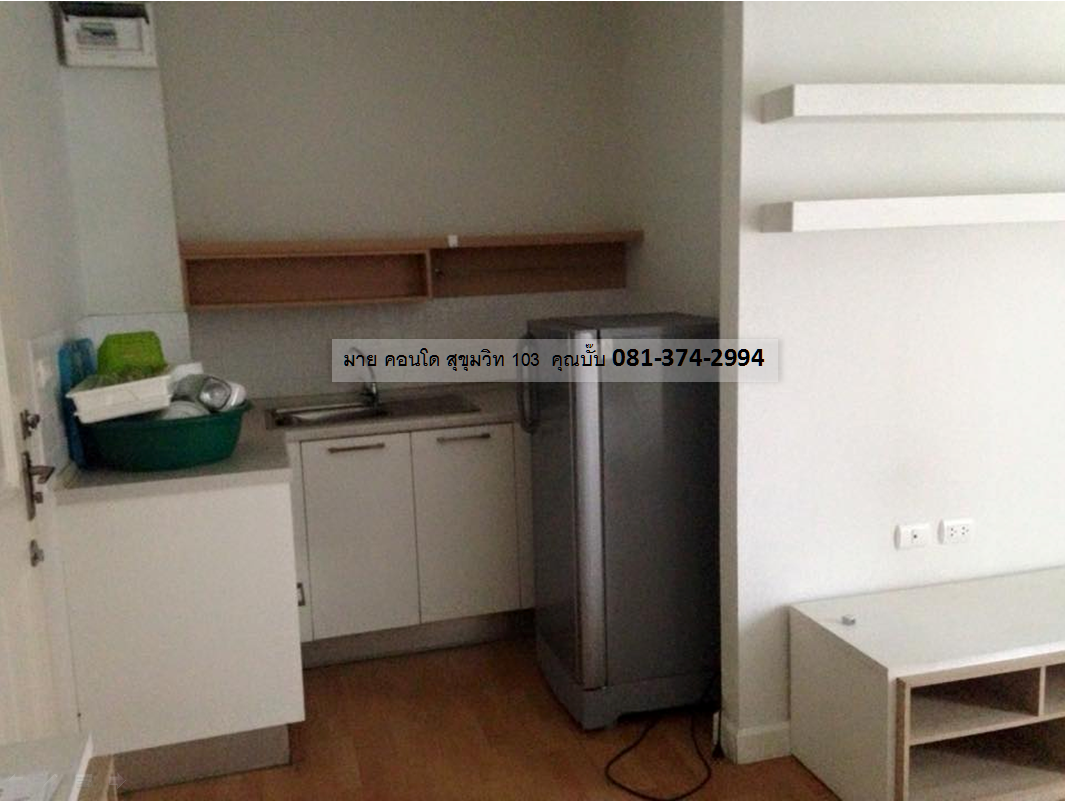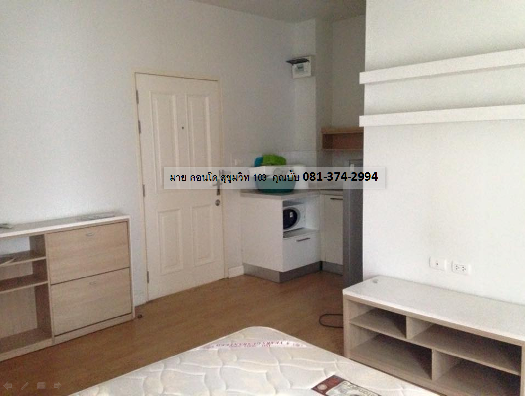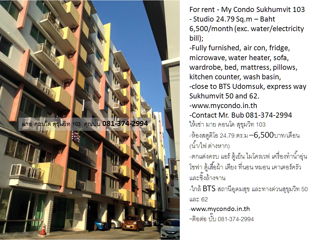 For rent - My Condo Sukhumvit 103 - Studio 24.79 Sq.m – Baht 6,500/month (exc. water/electricity bill); -Fully furnished, air con, fridge, microwave, water heater, sofa, wardrobe, bed, mattress, pillows, kitchen counter, wash basin, -close to BTS Udomsuk, express way Sukhumvit 50 and 62. -www.mycondo.in.th -Contact Mr. Bub 081-374-2994 ให้เช่า มาย คอนโด สุขุมวิท 103 -ห้องสตูดิโอ 24.79 ตร.ม –6,500บาท/เดือน (น้ำ/ไฟ ต่างหาก) -ตกแต่งครบ แอร์ ตู้เย็น ไมโครเวฟ เครื่องทำน้ำอุ่น โซฟา ตู้เสื้อผ้า เตียง ที่นอน หมอน เคาเตอร์ครัวและซิ๊งล้างจาน -ใกล้ BTS สถานีอุดมสุข และทางด่วนสุขุมวิท 50 และ 62 -www.mycondo.in.th -ติอต่อ บั๊บ 081-374-2994