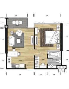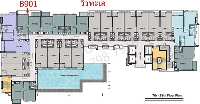 B901 ชั้น9 ขนาด 46 ตรม, ฝ้าสูง 2.60-2.80 เมตร วิวทะเล เฟอร์นิเจอร์บิวอินบางส่วน ห้องน้ำตกแต่งมาตรฐานโครงการ
