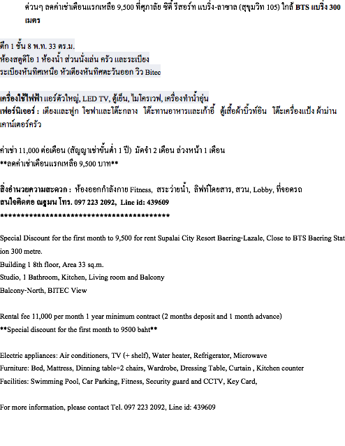 ขายคอนโดโครงการ ศุภาลัย ซิตี้รีสอร์ท สถานีแบริ่ง(สุขุมวิท105) - 50000 บาท ติดต่อคุณ นัยนา มูลยะ
