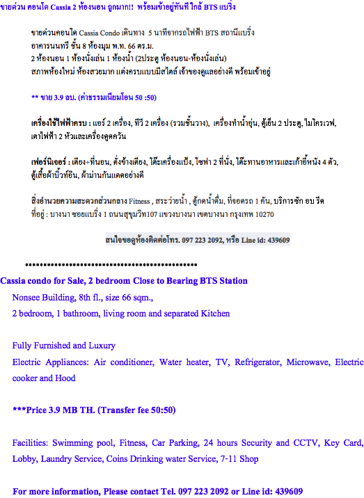 ขายคอนโดโครงการ cassia | แคสเซีย สุขุมวิท ซอย107 แบริ่ง1 - 3000000 บาท ติดต่อคุณ sukanya noichin