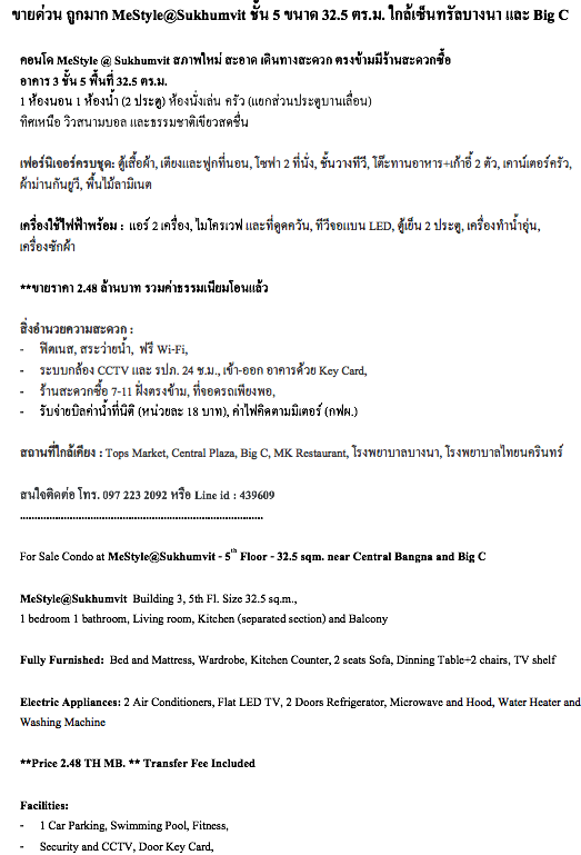 ขายด่วน ถูกมาก MeStyle@Sukhumvit ชั้น 5 ขนาด 32.5 ตร.ม. ใกล้เซ็นทรัลบางนา และ Big C