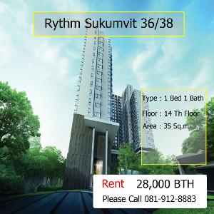 คอนโดRhythm สุขุมวิท 36/38 ให้เช่า 28,000 / เดือน ชั้น 14 ขนาดพื้นที่ 35 ตารางเมตร สนใจติดต่อ 081-912-8883 ไลน์ไอดี @easyhomeland ID - 192172 Rhythm 36/38, Sukhumvit. Rent 28,000 THB / month 14th floor, area of 35 square meters Interested contact Tel. 081-912-8883, Line id: @easyhomeland ID - 192172