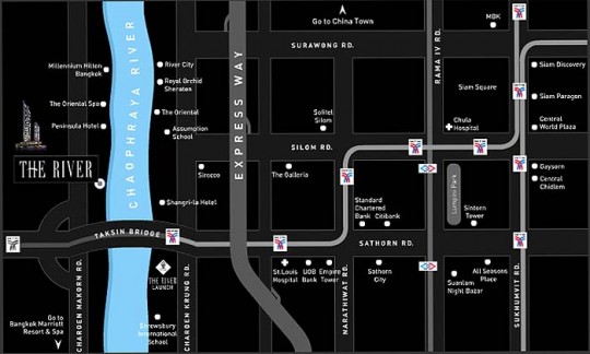 The River luxurious freehold condominium project by Raimon Land. The condo consists of two residential towers, the first tower The River South is 291 meters tall making it the second tallest building in Thailand with a total of 74 floors, the second tower The River North is 152 meters tall and a total of 45 floors rising above Chao Phraya River in Bangkok with completion date in 2012. The condo is located right on the river opposite Shangri-La hotel with only 5 minutes walk from Taksin bridge. Located near BTS Krung Thonburi will take you into Sathorn area filled with bars,restaurants and life style shopping malls,also it will take you towards central Bangkok and Sukhumvit road by changing at Siam BTS station. The condominium offers a selection of 1,2 and 3 bedroom luxury condo units for sale. All unit shave been design by J+H Boiffils architecture and design firm founded in Paris. The River has a total of 650 condos with 51 different condo unit types.