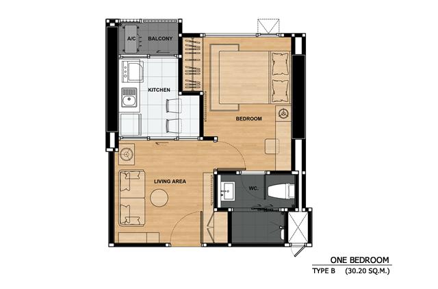 พื้นที่ 30.20 ตรม.1 ห้องนอน 1 ห้องน้ำ ห้องครัวแยกส่วน
