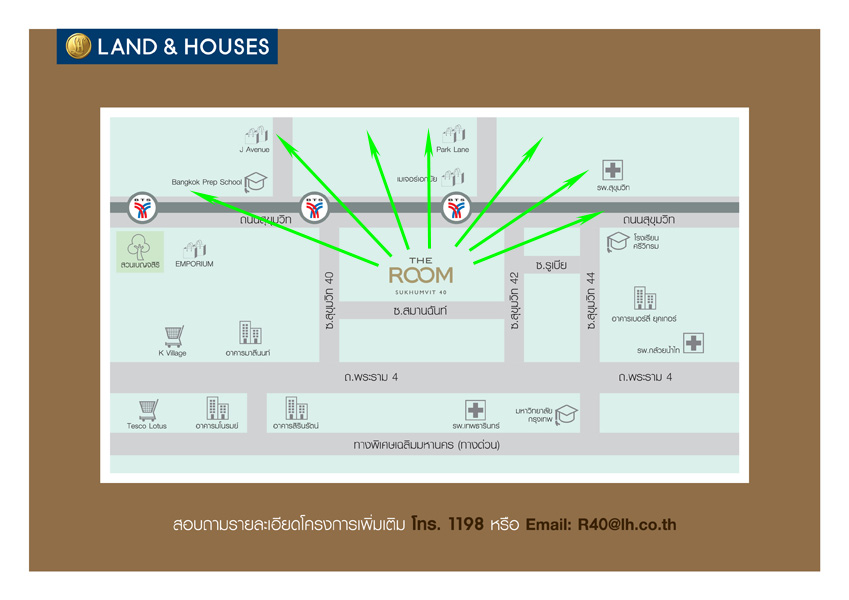 - เป็นโครงการคอนโดมิเนียม Low Rise 8 ชั้น บนพื้นที่ 1 - 3 - 7.00 ไร่ อยู่ในทำเลสงบระหว่างซอยสุขุมวิท 40 และ 42 จำนวนยูนิตเพียง 128 units เข้าได้ทั้งถนนพระราม4 และถนนสุขุมวิท