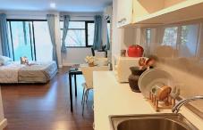 ตู้เสื้อผ้าโซฟาเตียงและที่นอนโต๊ะทำงาน และเก้าอี้โต๊ะเครื่องแป้งโต๊ะทานอาหาร และเก้าอี้ครัวบิลท์อินเตาไฟฟ้าตู้เย็นไมโครเวฟสติกเกอร์ที่จอดรถเครื่องปรับอากาศ + รีโมต