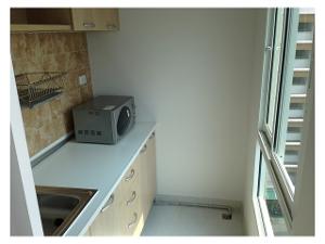Kitchen room : Separate kitchen areas. A set of built-in kitchen. Hanging on the balcony with the first set of cabinets, shelves and two cabinet under the sink with the door closed the first set, water purifier, microwave, washing machine.