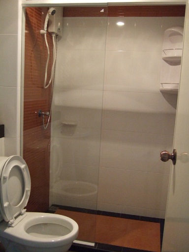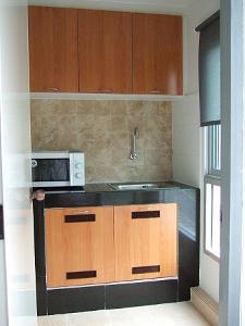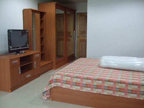 For Rent: Studio condo 31 sqm. with kitchen. New Furnitures: 6 foot bed, standing dressing table, 2 meter slide-door closet, TV desk with LCD 32 inches, 7 Q refrigerator, Daikin air conditioning 18000 BTU, electric warm shower.