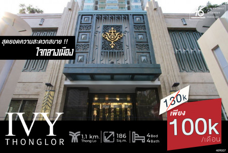 ให้เช่าถูก!! คอนโด IVY ทองหล่อ 23 ขนาด 186 ตร.ม 4 นอน 4 น้ำ ชั้น 10 ใกล้ BTS ทองหล่อ-LLH