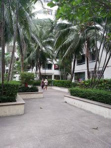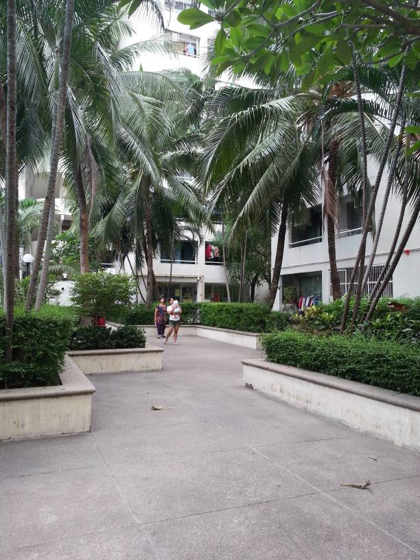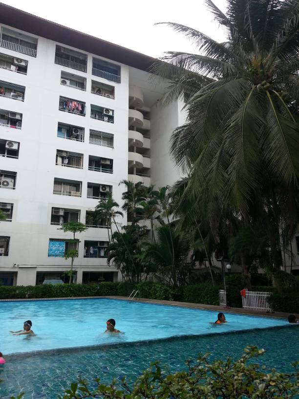 พื้นที่รอบอาคารแบ่งเป็นพื้นที่สวน และสระว่ายน้ำขนาดกลาง มีทั้งสระเด็กและผู้ใหญ่