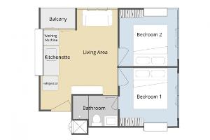 - ลักษณะห้อง 2 ห้องนอน 1 ห้องน้ำ 1 ห้องนั่งเล่น และเคาน์เตอร์ครัว