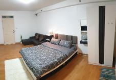 - ห้องนอน/ ห้องนั่งเล่น ที่นอนมาพร้อมชุดเครื่องนอน โต๊ะเครื่องแป้ง และตู้เสื้อผ้า