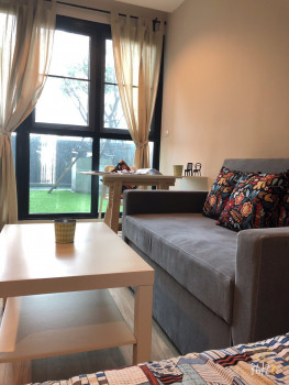 1 ห้องนอน 1 ห้องน้ำ 1 ห้องครัว มุมนั่งเล่น วิวสวน