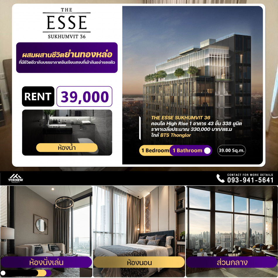 เช่าราคาโดนใจ The Esse Sukhumvit 36 ติด BTS ทองหล่อ เฟอร์นิเจอร์จัดให้ครบ ชั้นสูง วิวสวย