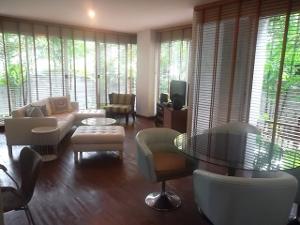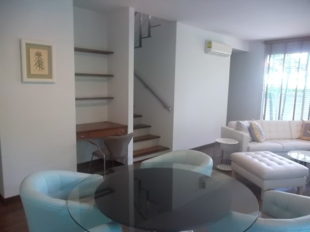 An Excellent fully furnished Condominium with 2 floor 105 sq. m. Very nice with 2 bedroom and 3 bathroom. Very good layout with useable spaces. Open plan kitchen with full equipment: stove, oven, washing machine and dryer. Very quiet and private location and a very cozy garden with a nice trees and flowers. 55,000 Bath/ month.