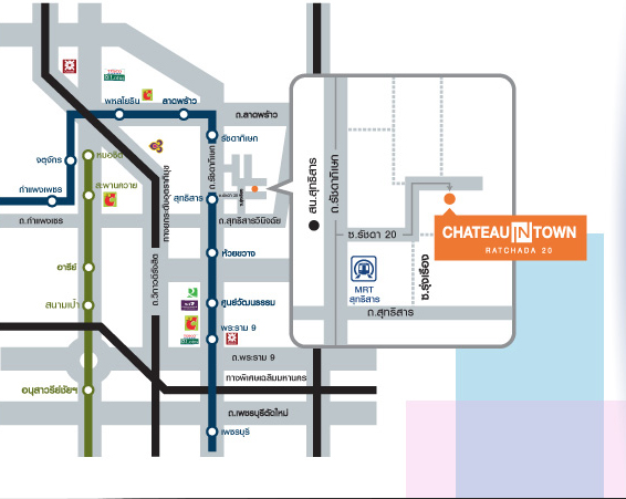 ชาโตว์ อินทาวน์ รัชดา20 ตั้งอยู่ในซอยรัชดา20 ซอยปรีชา คอมเพล็กซ์ที่เป็นอาคารสำนักงานเยอะๆ ตรงข้ามกับ สน.สุทธิสาร
