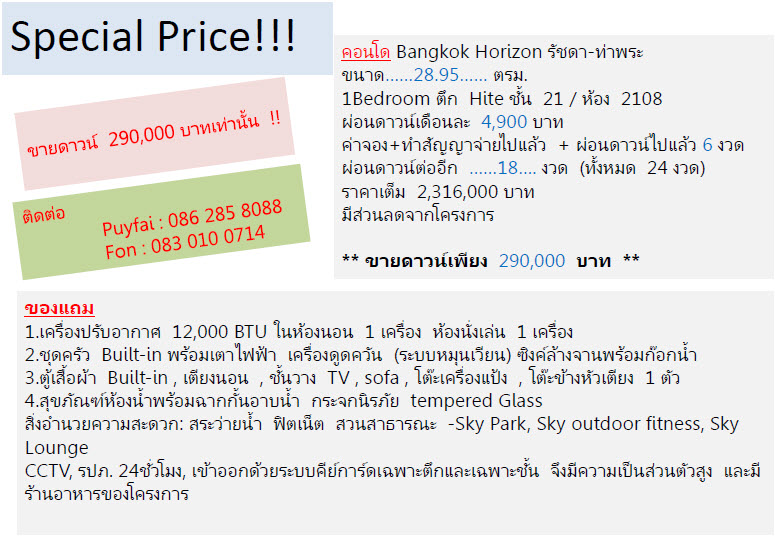 ขายคอนโดโครงการ Bangkok Horizon รัชดา-ท่าพระ - 290000 บาท ติดต่อคุณ Sarunya Sinutok