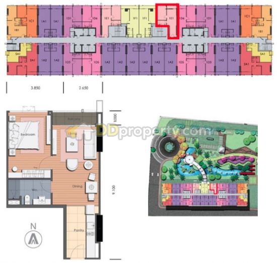 คอนโด Abstracts พหลโยธิน ชั้น 5 : 1BR type 1E1 ขนาด 45.3ตร.ม. หันหน้าทิศเหนือ เห็นวิวสวนชัดเจน