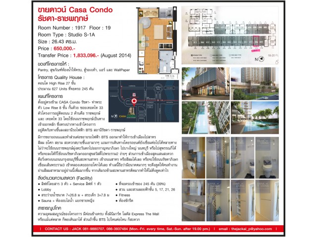 ขายคอนโดโครงการ Casa Condo รัชดา ราชพฤกษ์ - 2190000 บาท ติดต่อคุณ Chatchanok Ratrinart