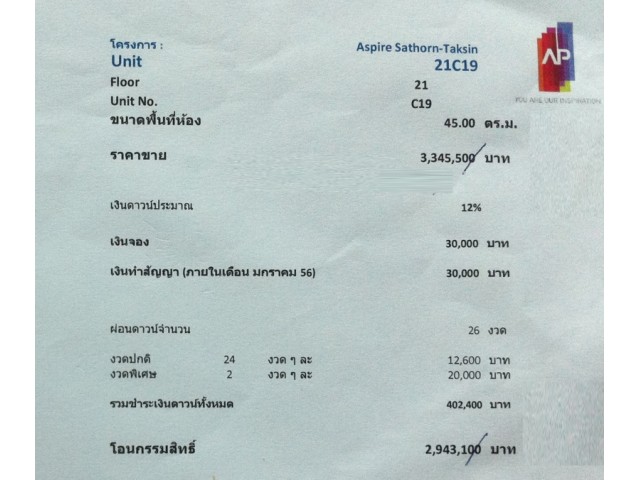 | โครงการ | คอนโด แอสปายสาทร-ตากสิน |