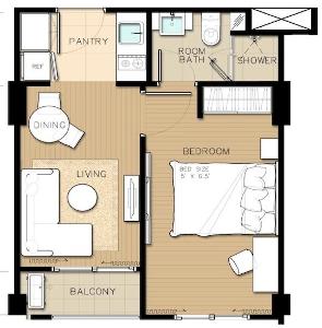 - 1 ห้องนอน 1 ห้องน้ำ ระเบียงหันทิศตะวันออก