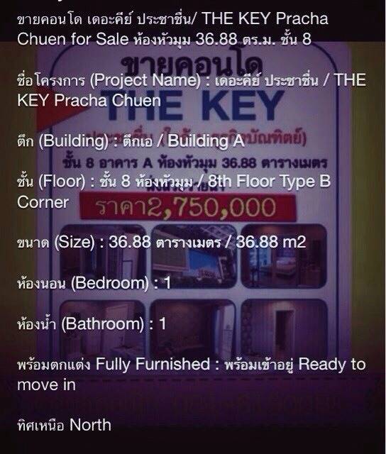 ขายคอนโดโครงการ The Key ประชาชื่น - 2650000 บาท ติดต่อคุณ มิกซ์ มิกซ์