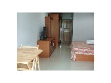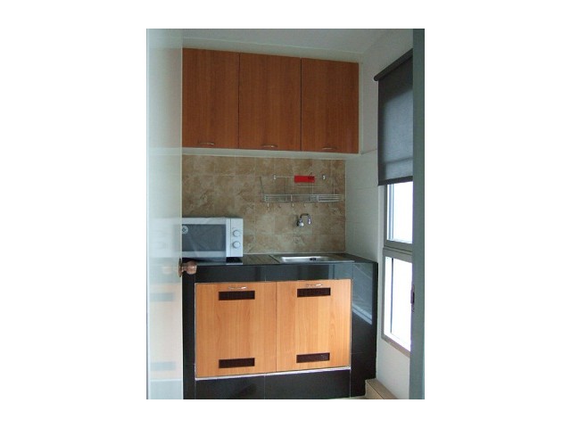 For Rent: Studio condo 31 sqm. with kitchen. New Furnitures: 6 foot bed, standing dressing table, 2 meter slide-door closet, TV desk with LCD 32 inches, 7 Q refrigerator, Daikin air conditioning 18000 BTU, electric warm shower.