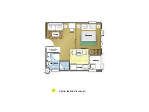 Den Condoวิภาวดี ขนาดห้อง 29 ตร.ม. ห้องมุม(วิวไม่มีตึกบัง) เลขที่ห้อง 2/152 Type:B อาคารA ชั้น7(คอนโดมี8ชั้น) ภายในห้องมีเฟอร์นิเจอร์ เคาว์นเตอร์ครัว, เก้าอี้2ตัว+โต๊ะทานข้าว, โซฟา, โต๊ะวางของ, เตียงนอน, ตู้เสื้อผ้า, แอร์ไดกิ้น 1เครื่อง(ห้องนอน)